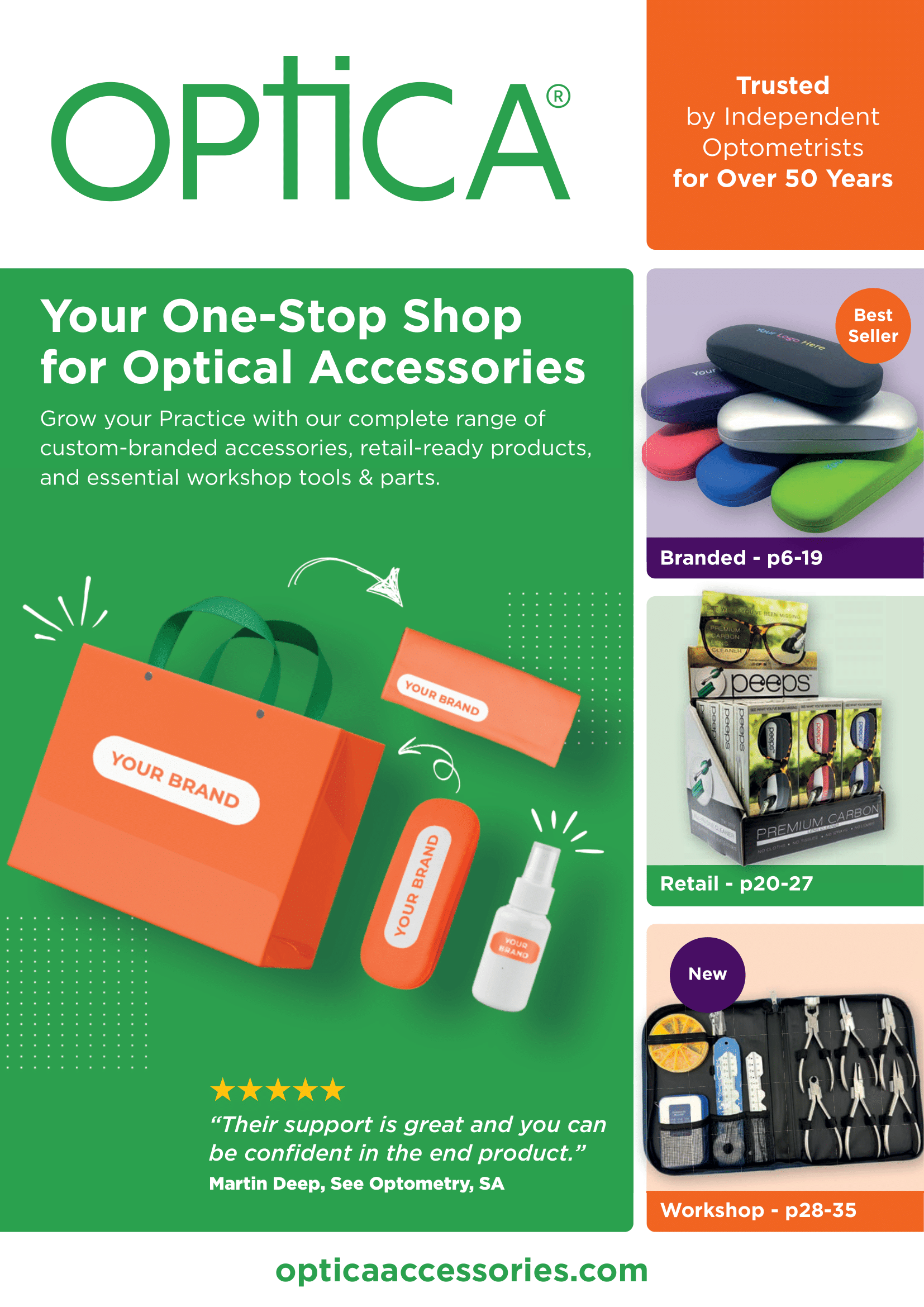 Discover the 2025 Optica Product Catalogue — your one-stop shop for optical accessories. Tailored for independent practices across Australia and New Zealand.