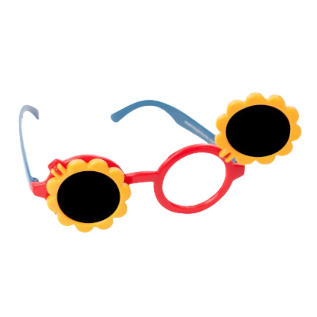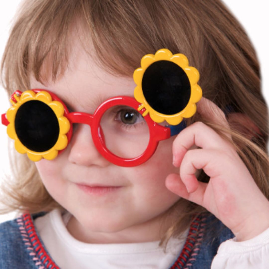 Robust plastic glasses for uniocular vision testing. Comprises one pair with sunflower flip-up lenses to occlude each eye in turn. They measure 10.5cm across the inside of the frame.