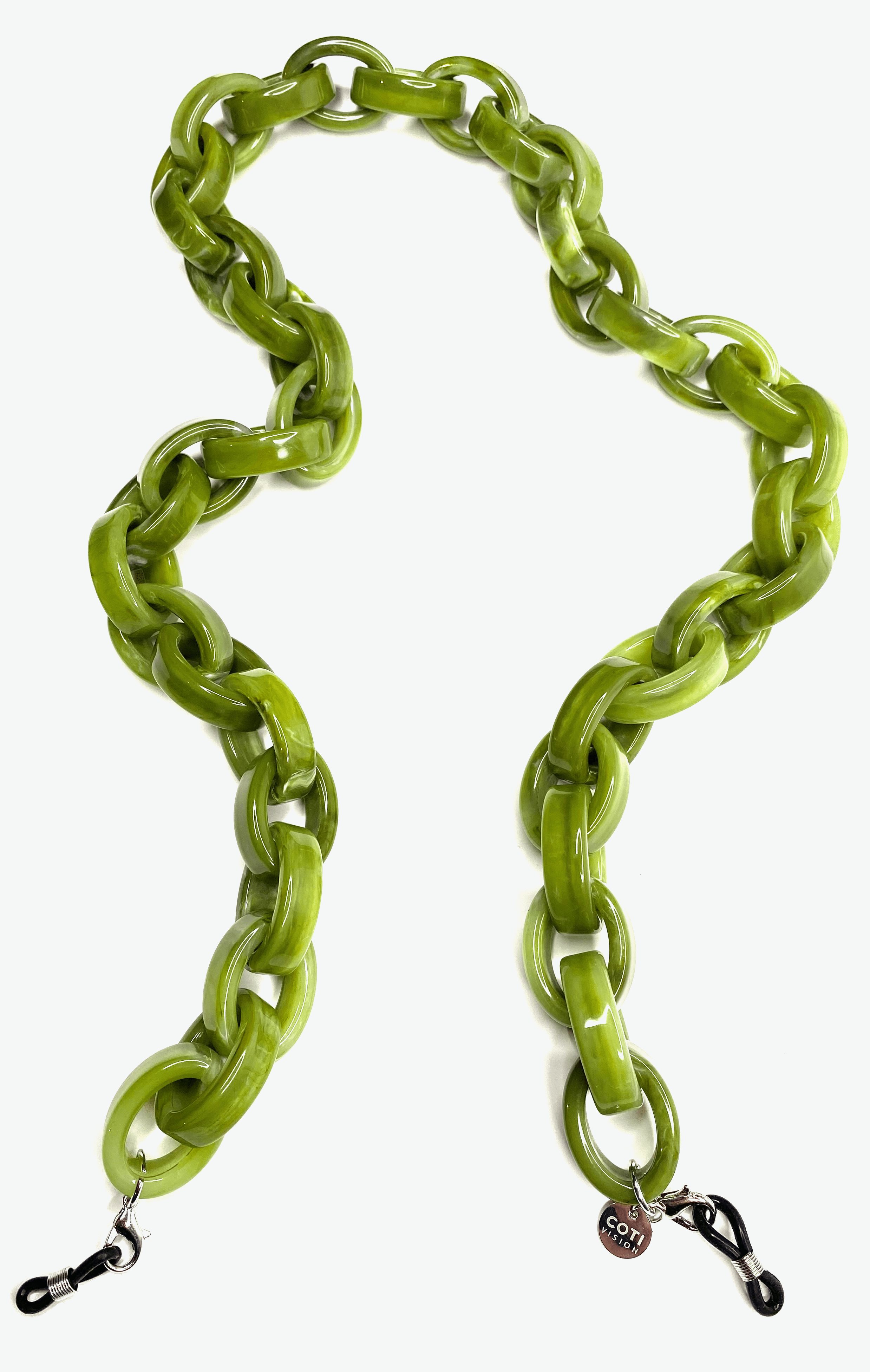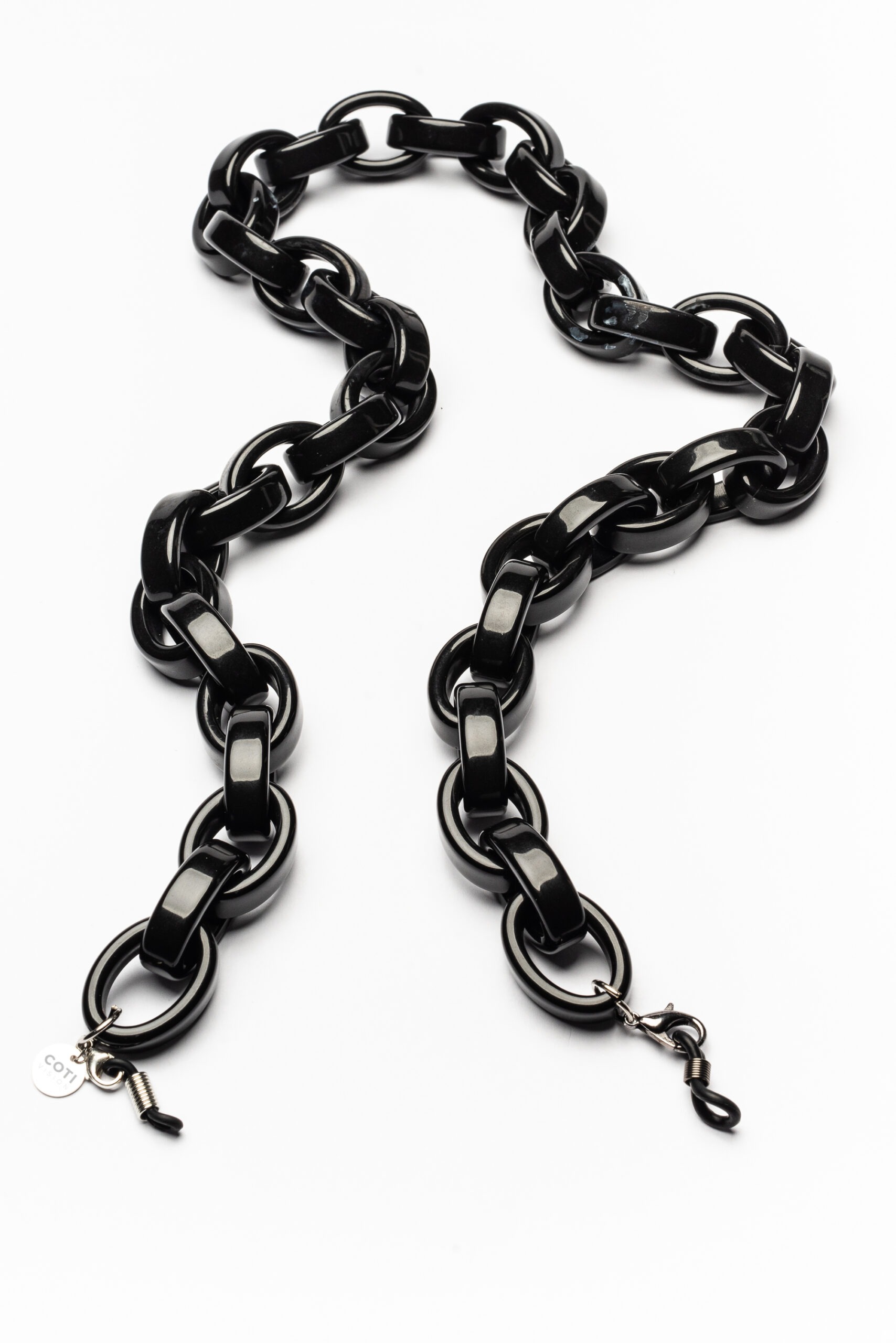 To attach the glasses chain to your frame, place the silicone loops located at each end of the chain onto the temples of your glasses. Push the small metal slide on the loop to tighten it securely to the temple.
