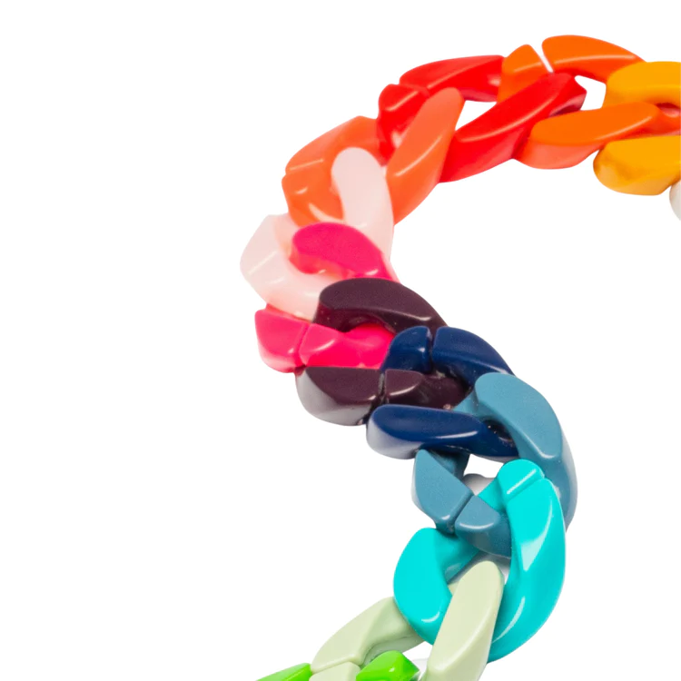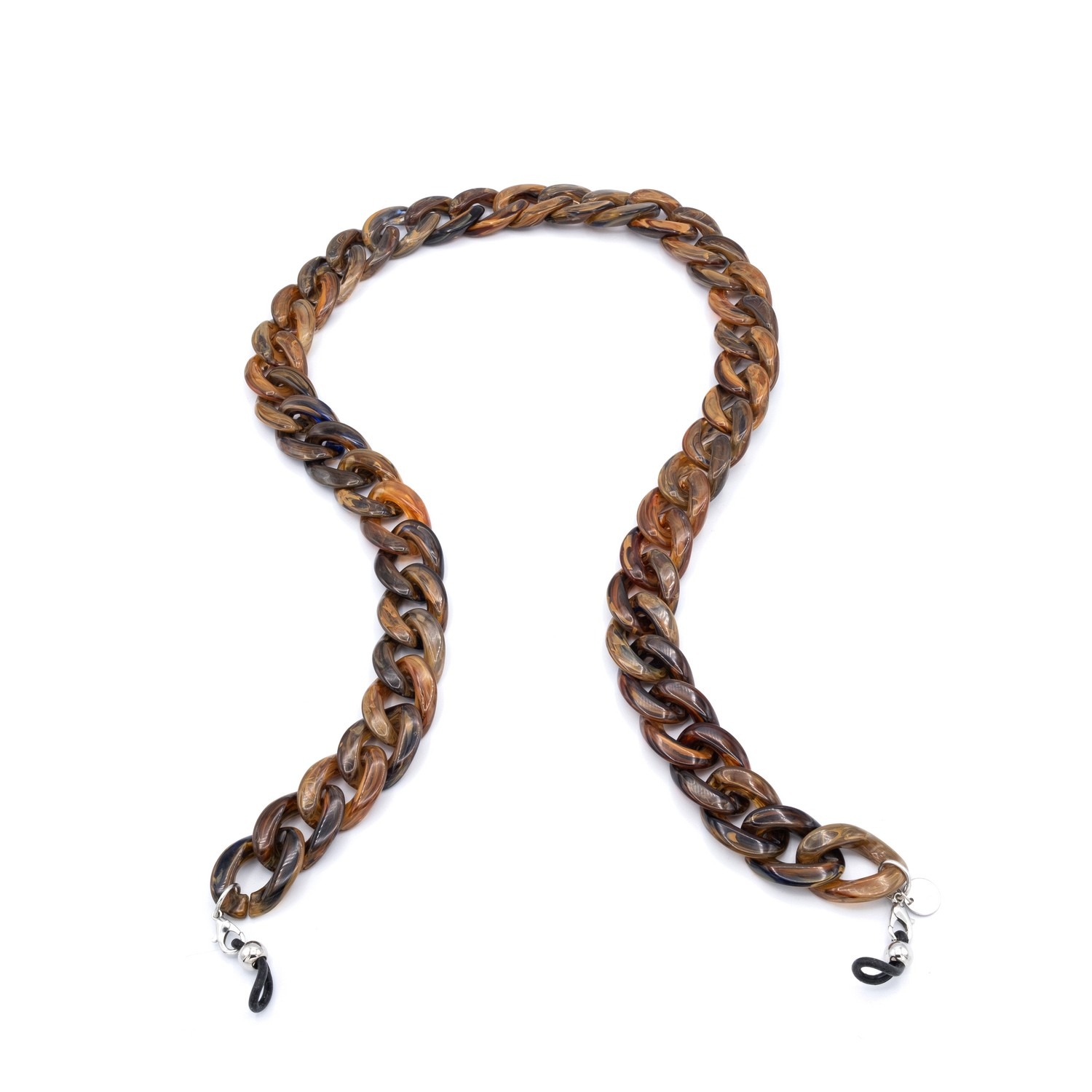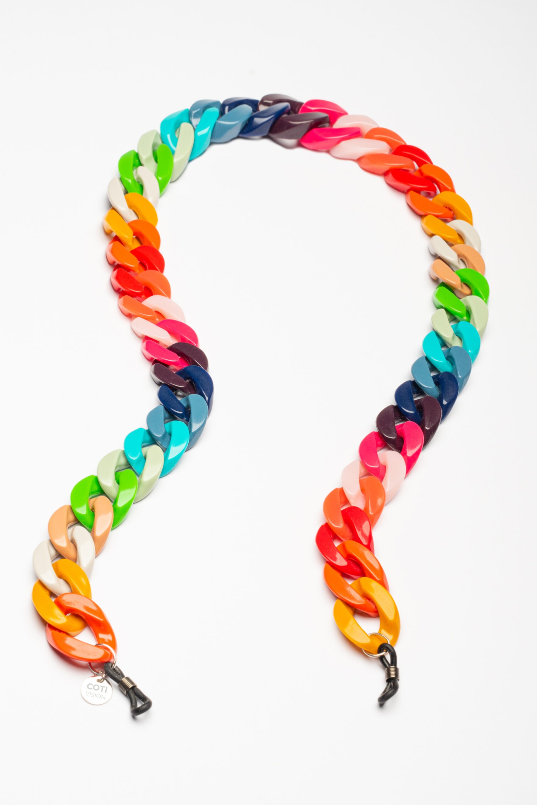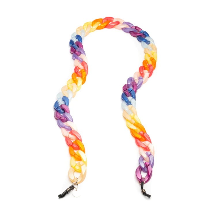 To attach the glasses chain to your frame, place the silicone loops located at each end of the chain onto the temples of your glasses. Push the small metal slide on the loop to tighten it securely to the temple.