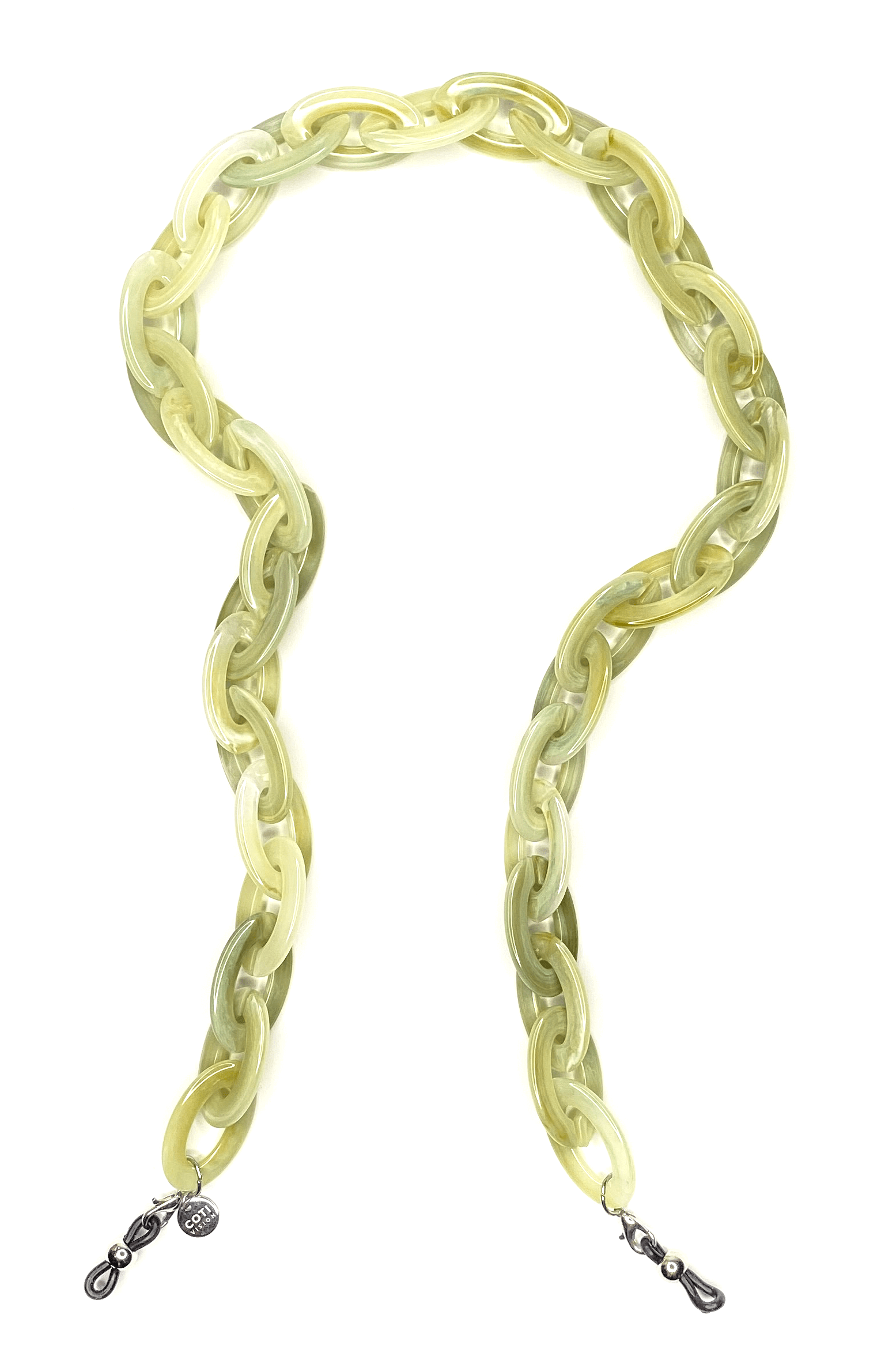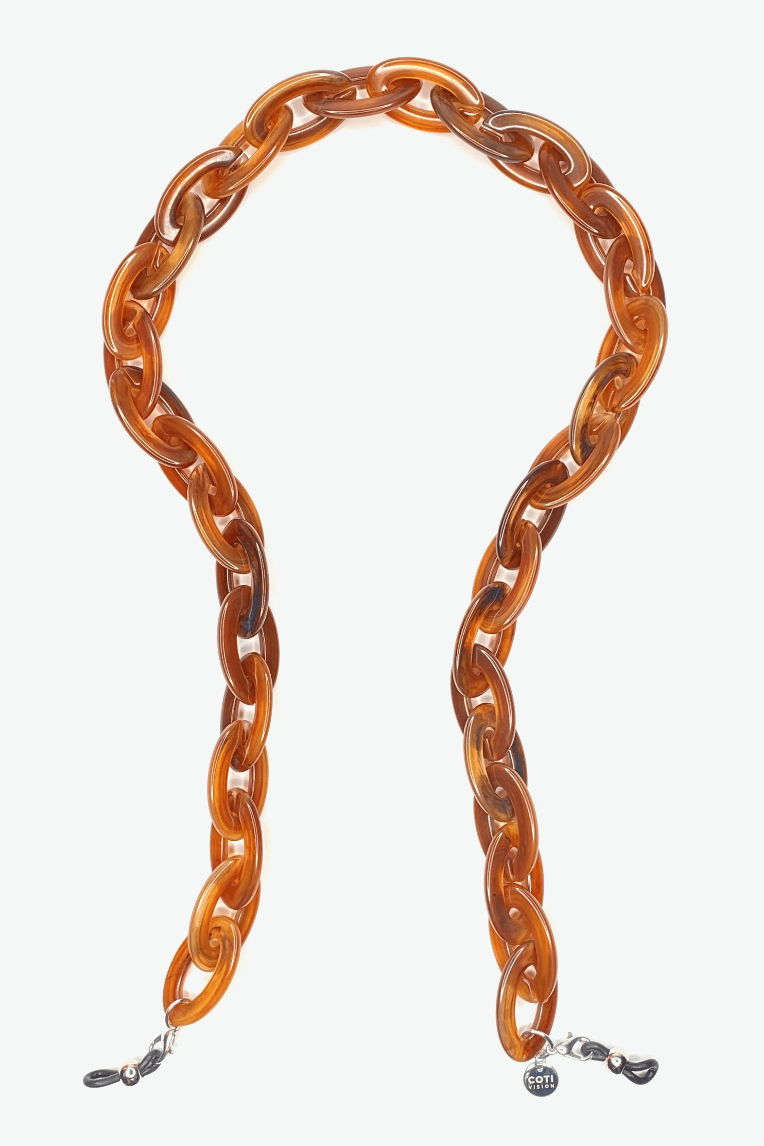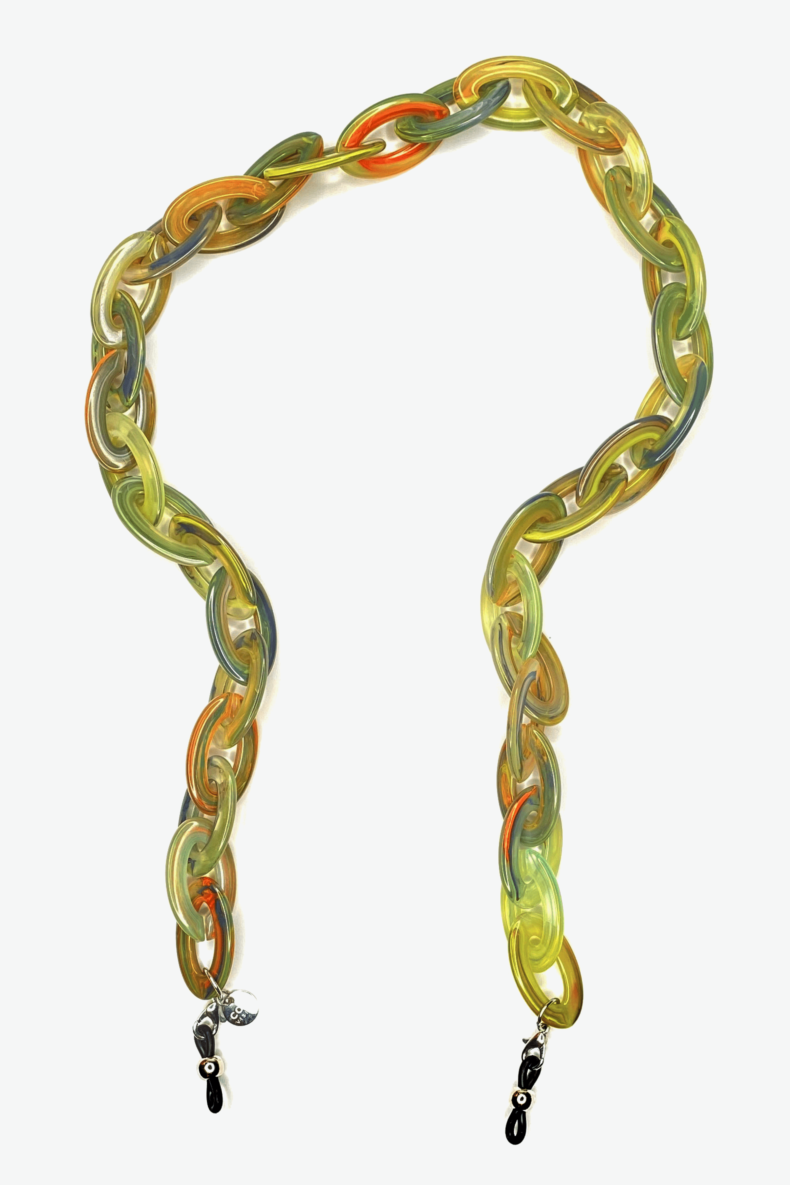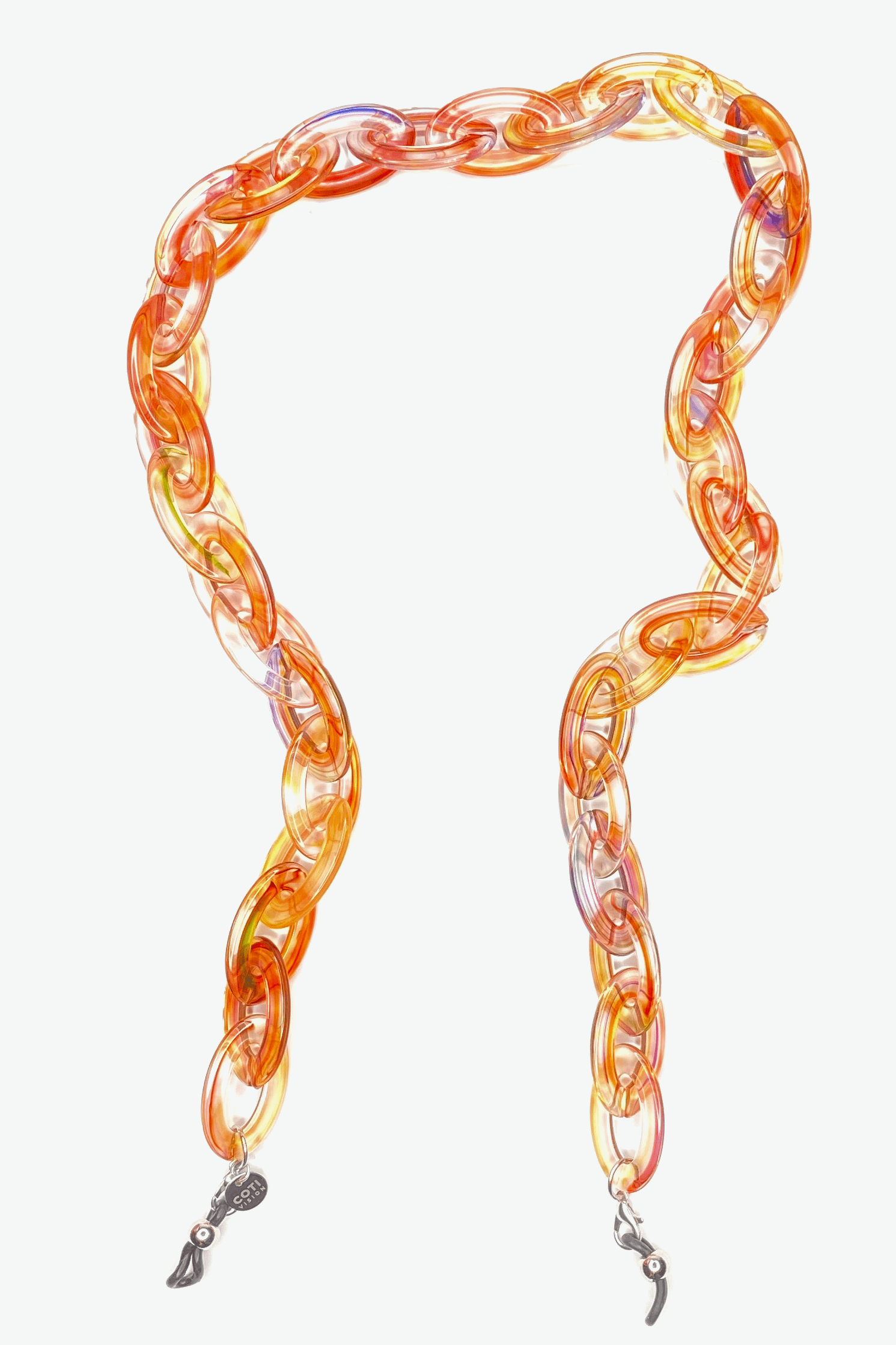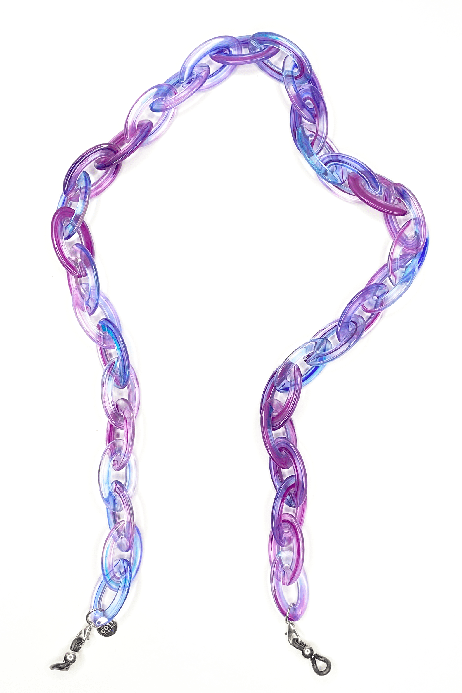 To attach the glasses chain to your frame, place the silicone loops located at each end of the chain onto the temples of your glasses. Push the small metal slide on the loop to tighten it securely to the temple.