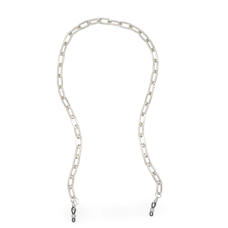 To attach the glasses chain to your frame, place the silicone loops located at each end of the chain onto the temples of your glasses. Push the small metal slide on the loop to tighten it securely to the temple.