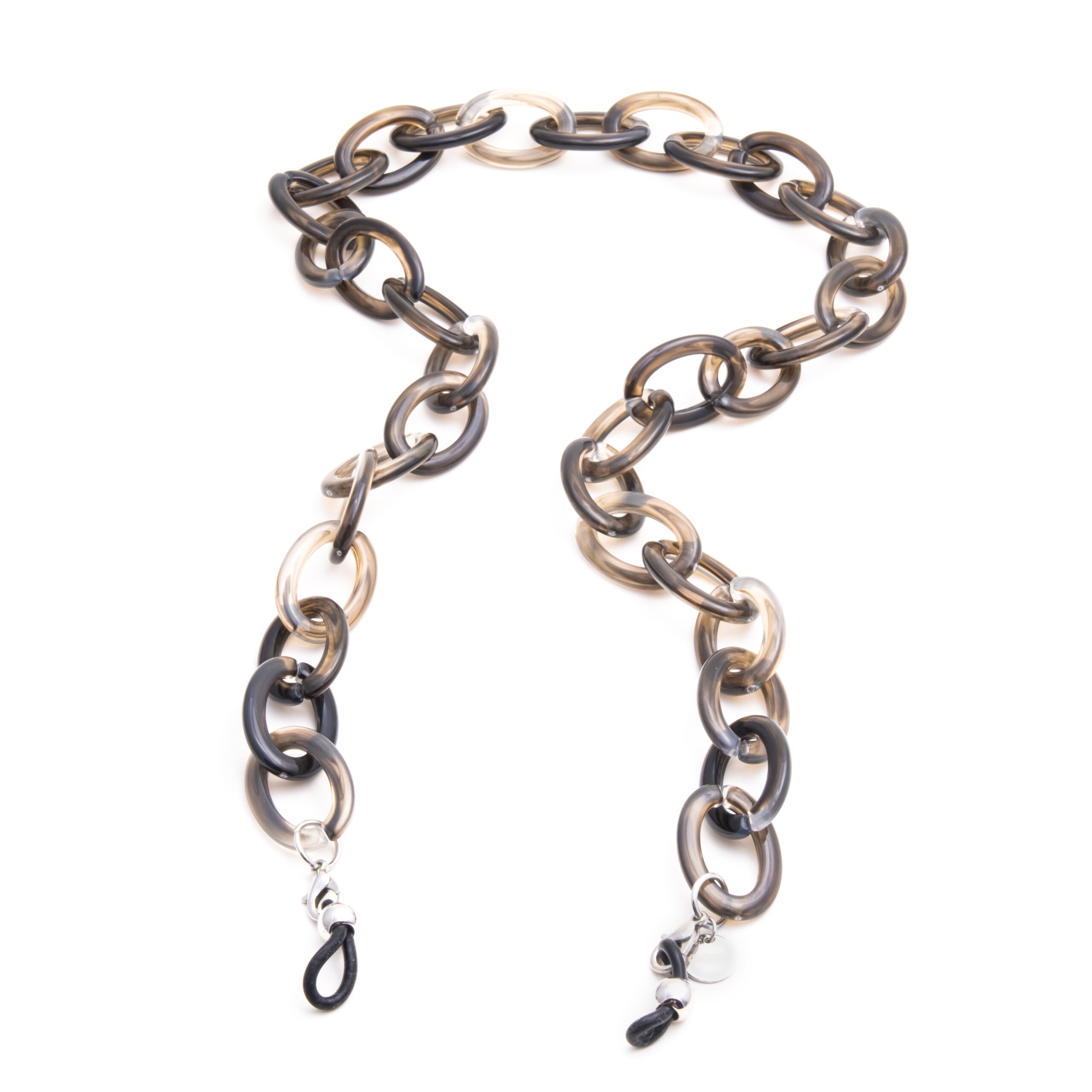 To attach the glasses chain to your frame, place the silicone loops located at each end of the chain onto the temples of your glasses. Push the small metal slide on the loop to tighten it securely to the temple.