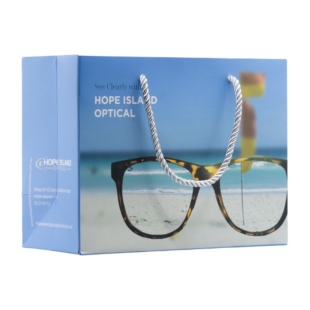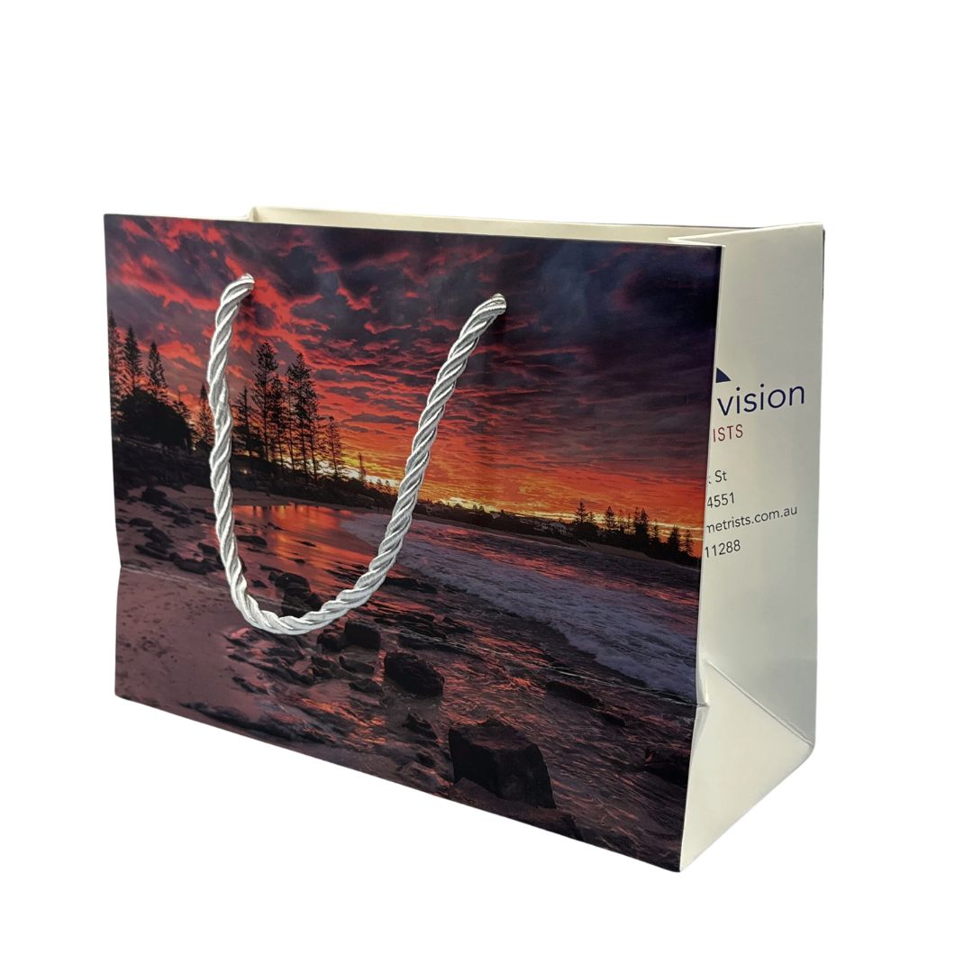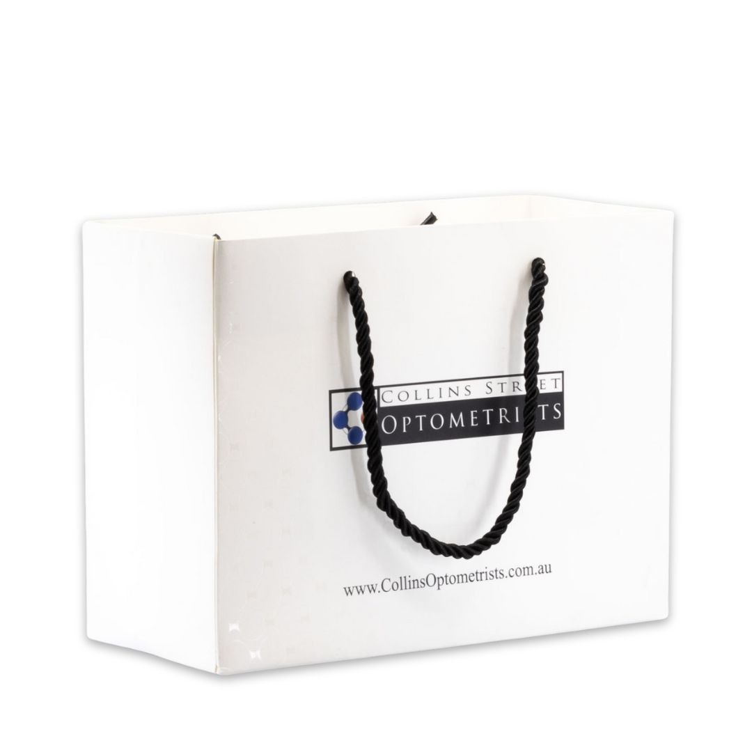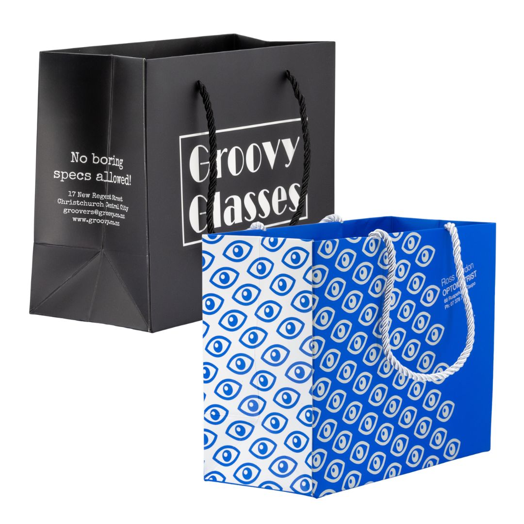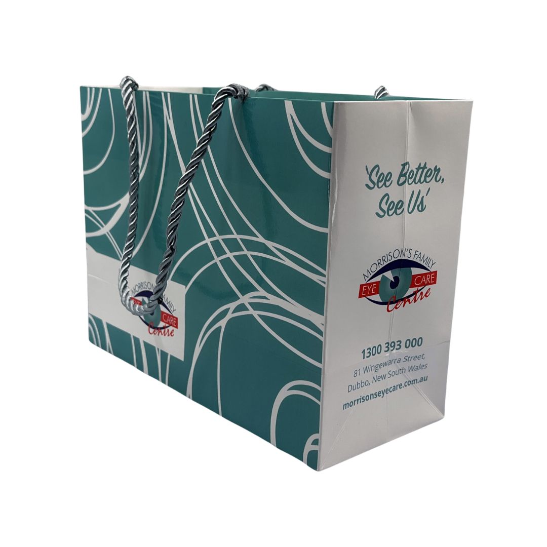 Custom printed paper bags are a fantastic way to send your brand out the door with each and every customer. Slim rope handles and square shape bag are suitable for all manner of products. 24 x 18 x 10cm