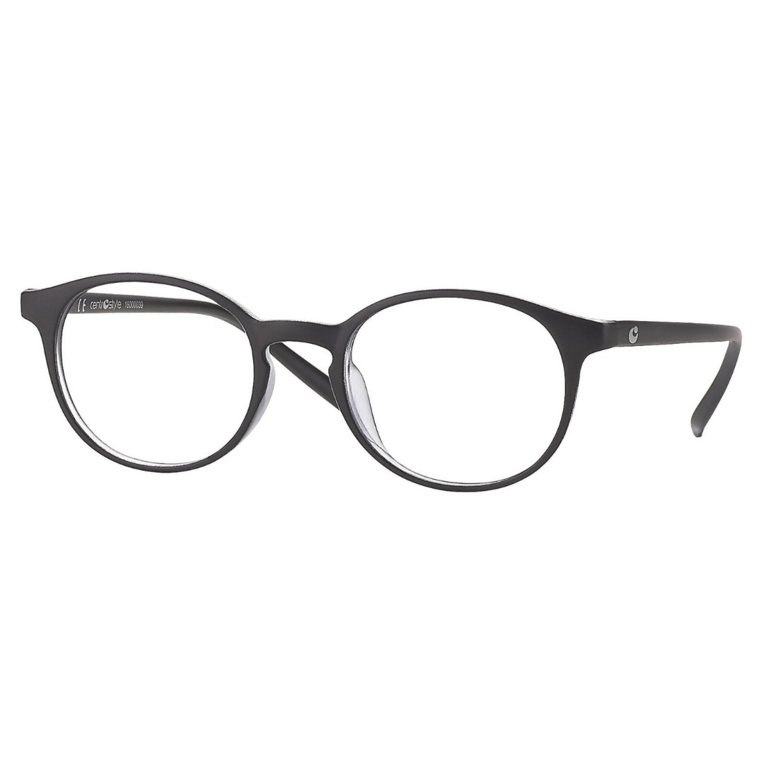 Plastic reading glasses with metal hinges. Frosted front and sides.