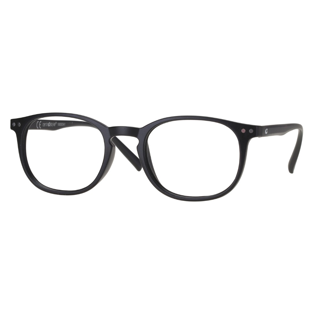 Plastic reading glasses with metal pins on the front. The metal hinge ensures greater resistance.