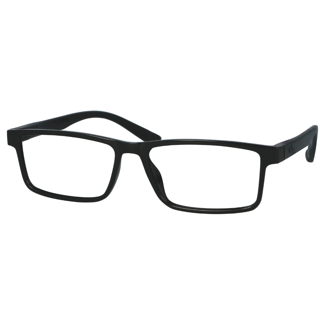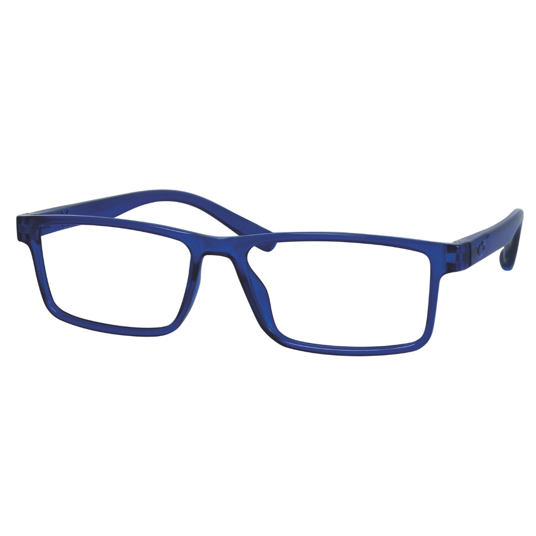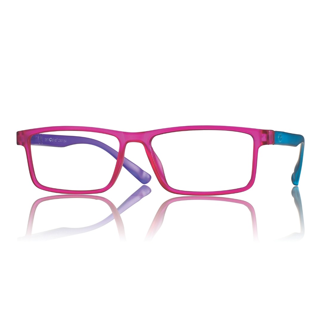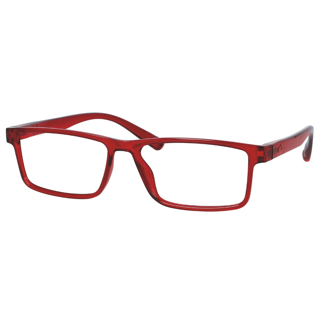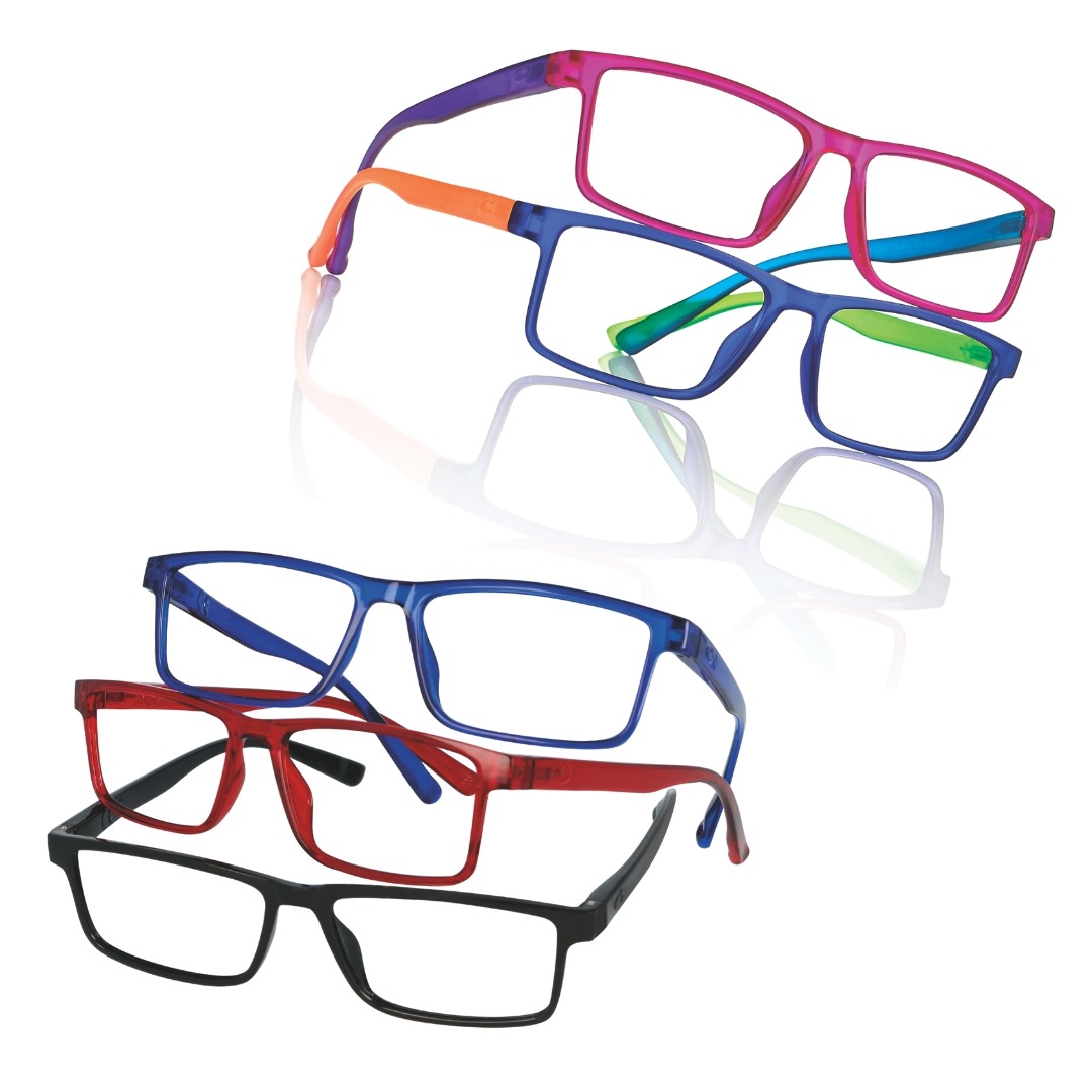 Plastic reading glasses with integrated spring hinges and shiny finishing.