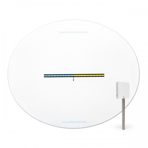 These cards allow direct measurement of the distance and near phorias in real space or with a phorpter. The patient simply has to tell which number the arrow points to. Any odd number (in yellow) shows esophoria while the even numbers (in blue) shows exophoria. An AC/A can quickly be determined with trial lenses.