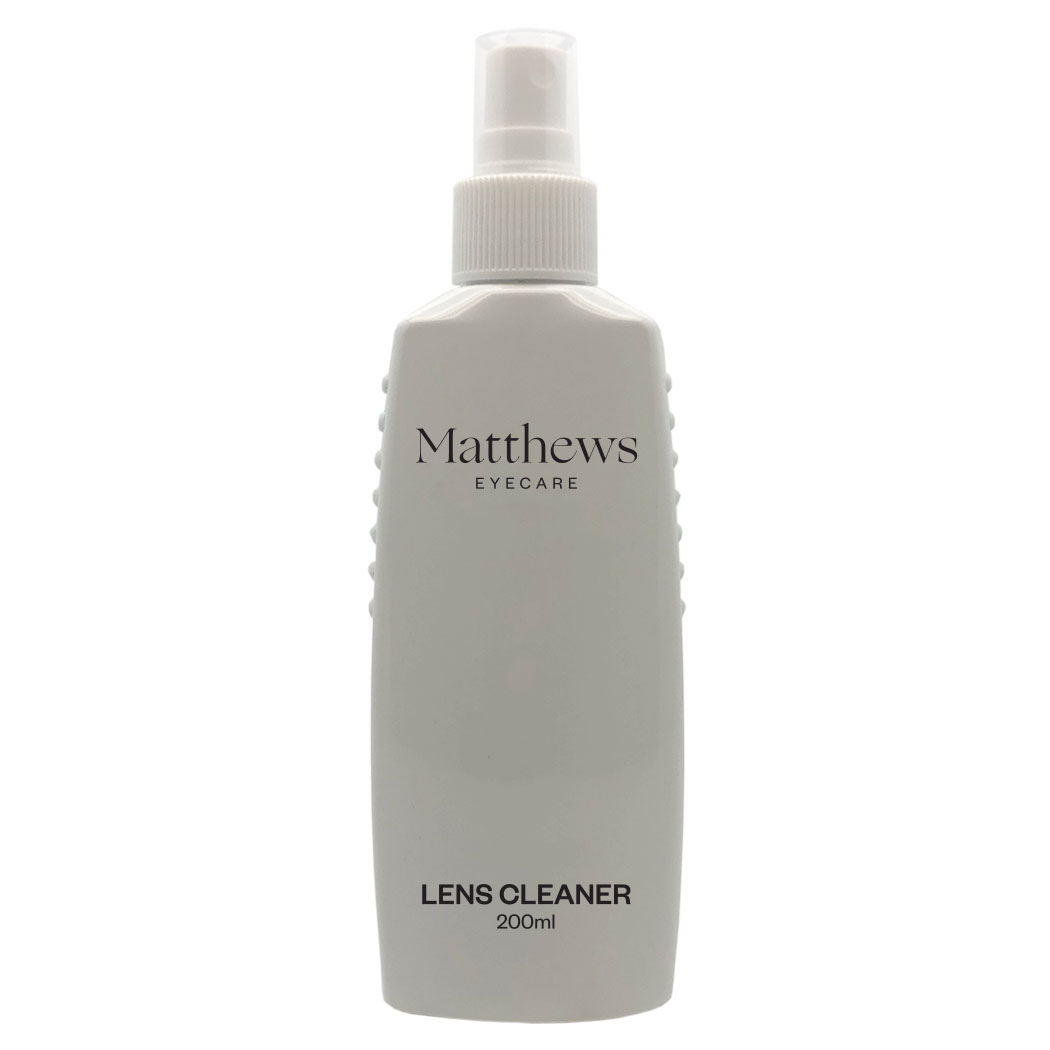 Matthews branded lens cleaning solution in a refillable 200ml spray bottle.