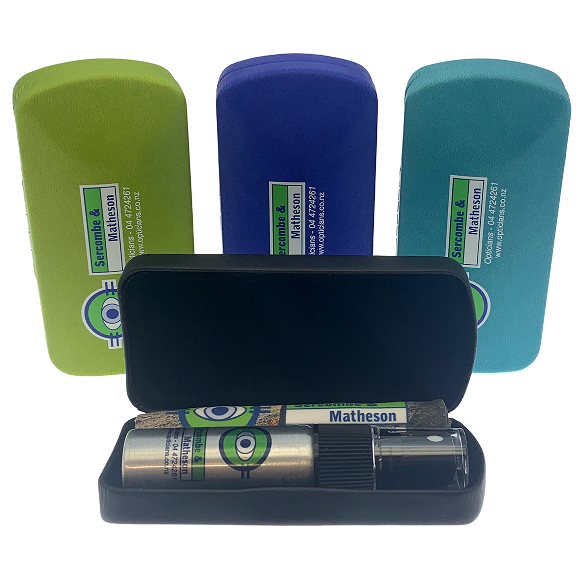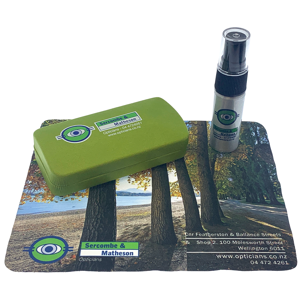 The companion kit covers all bases with an eyewear case, lens cleaning solution and microfibre cloth. A high-quality kit to offer your clients as is or branded with your business details.