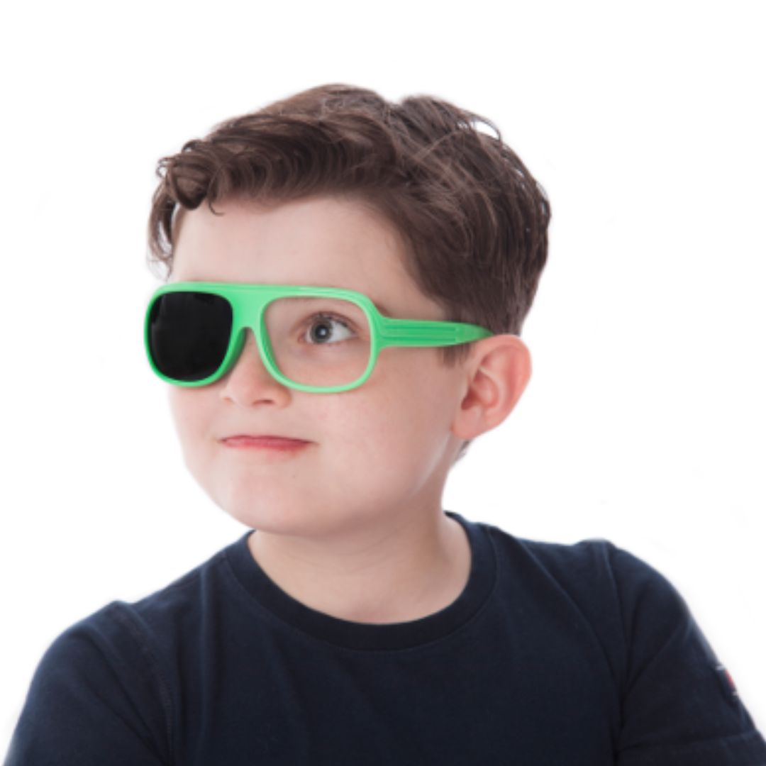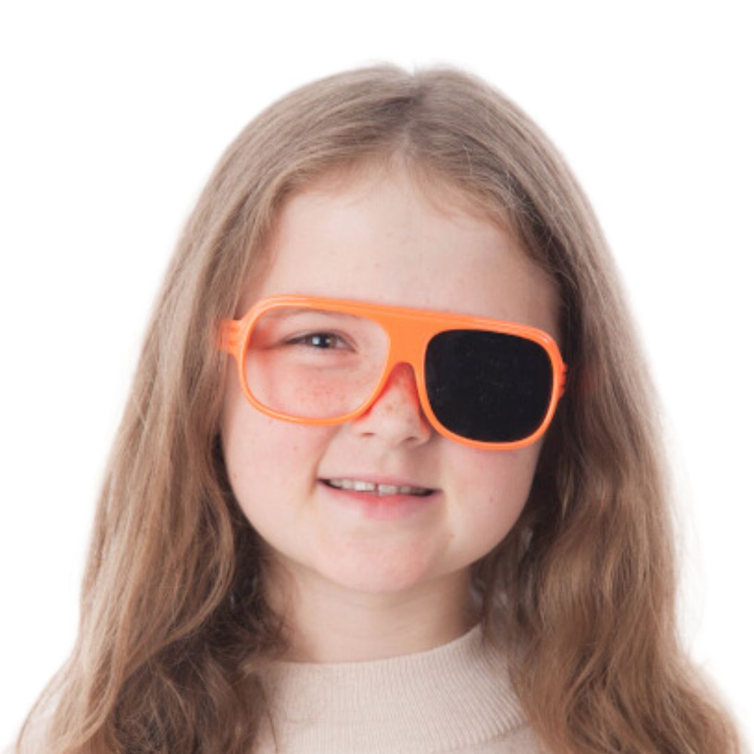 Robust plastic glasses for uniocular vision testing. Set of two pairs, neon orange and green in colour. They measure 11.5cm across the inside of the frame.